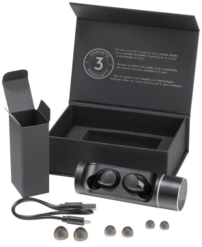 Беспроводные наушники с первоклассным качеством звука. Можно хранить и заряжать на цилиндрической металлической подставке, которая может быть украшена светящимся логотипом. С помощью аккумулятора в подставке наушники можно зарядить два раза. Встроенный микрофон. Технология шумоподавления CVC6.0. Bluetooth® 5.0. Технология EDR (Enhanced Data Rate). В комплект входят 3 насадки для наушников разных размеров для оптимального восприятия звука. Патент Ведомства по интеллектуальной собственности Европейского союза. . Пластик ABS, Алюминий.