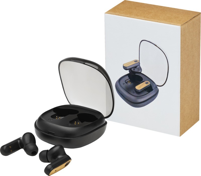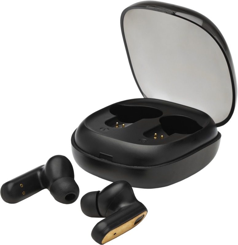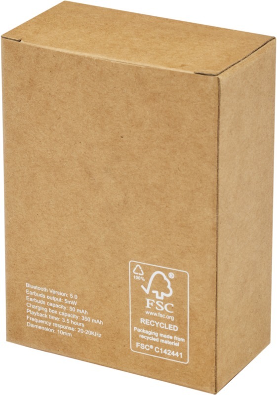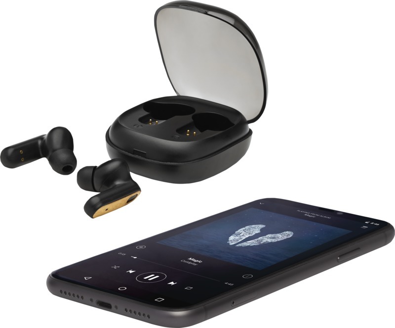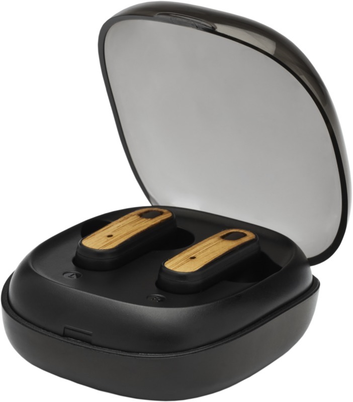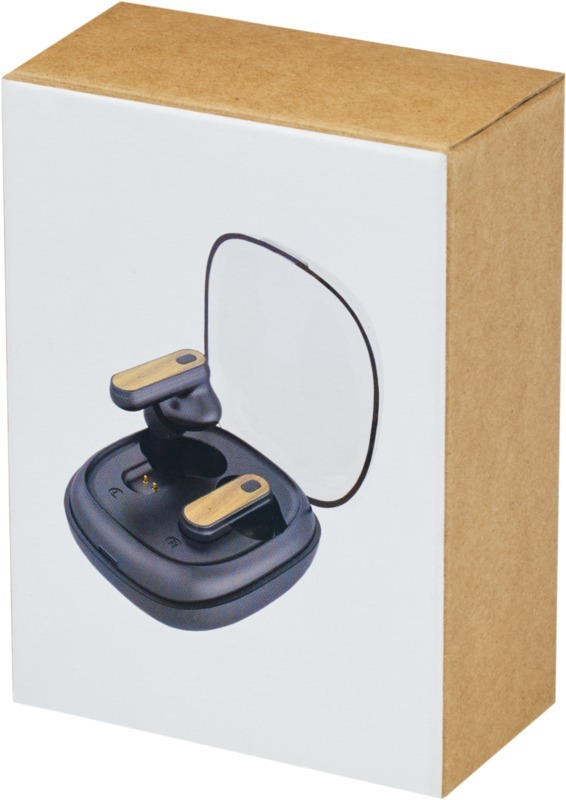 Внутриканальные бамбуковые наушники TWS с функцией автоматического подключения, облегчающей соединение с мобильным устройством. Время воспроизведения на максимальной громкости составляет до 3,5 часов, наушники можно полностью зарядить в течение 2 часов. Bluetooth® 5.0 с радиусом действия до 10 метров. Многофункциональная кнопка с функциями воспроизведения/паузы/переключения к следующей или предыдущей дорожке/принятия или отклонения телефонного звонка. В комплект входят 3 ушные насадки разных размеров для оптимального комфорта. Поставляется в подарочной коробке и инструкцией по эксплуатации (изготовленных из экологичных материалов). Пластик ABS, Бамбуковое дерево. Упаковка: FSC Recycled 100% P5.1 CU-COC-877277.