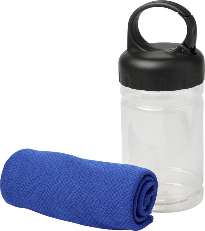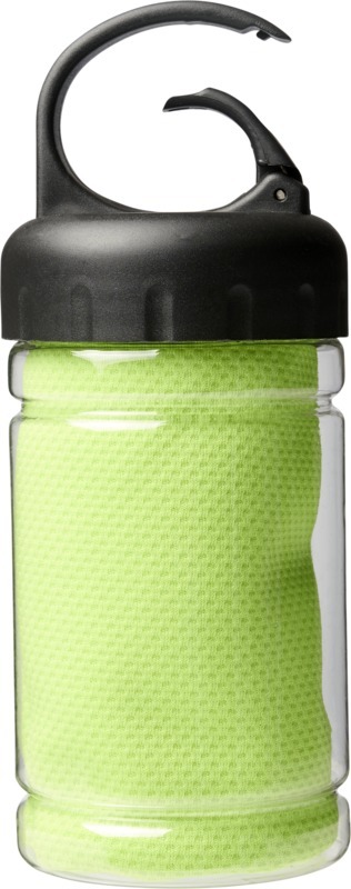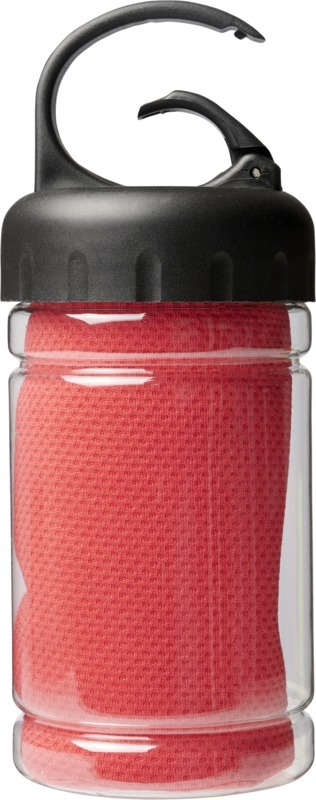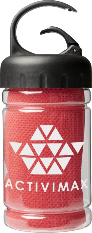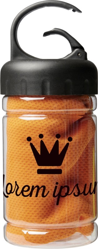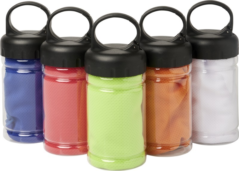 Быстро впитывающее, быстро сохнущее и стираемое охлаждающее полотенце сохраняет прохладу во время тренировок или любых других занятий на свежем воздухе. Поставляется в ПЭТ-контейнере с ручкой и встроенным карабином для удобной переноски. Доступно в 5 ярких цветах. На контейнере изображен большой логотип, он также может быть и на самом охлаждающем полотенце. Размер: 30 x 80 см. Пластик PET.