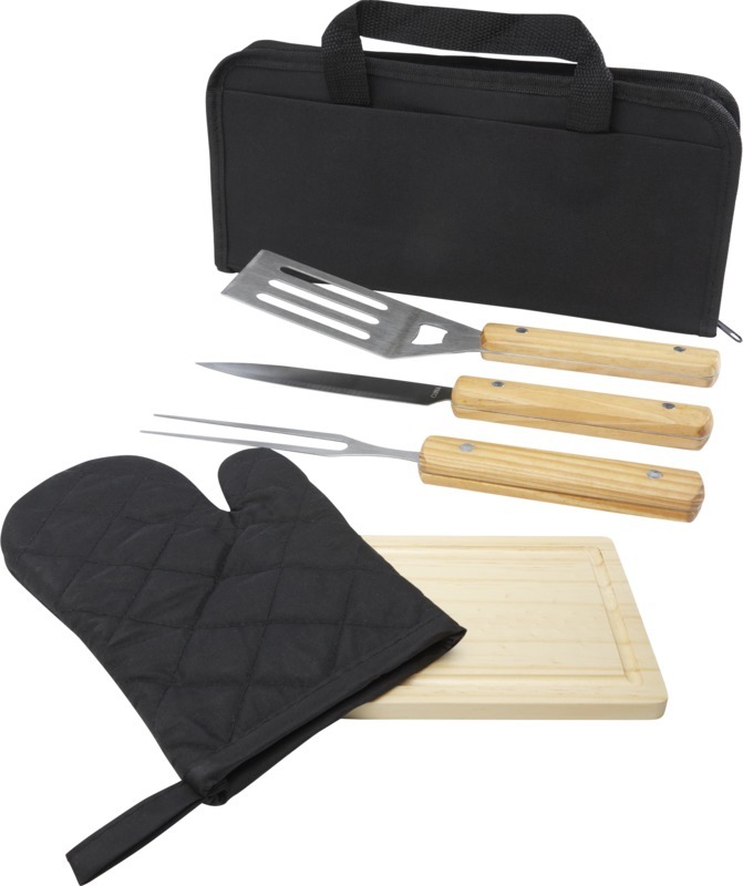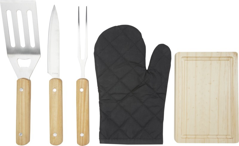 Набор для барбекю из 5 предметов: лопатка (29 x 7 см), вилка (29 x 1,7 см), нож (29 x 2,4 см), разделочная доска (19 x 13 x 1,1 см) и рукавица (25 x 16 см). Нейлон, нержавеющая сталь, Дерево.