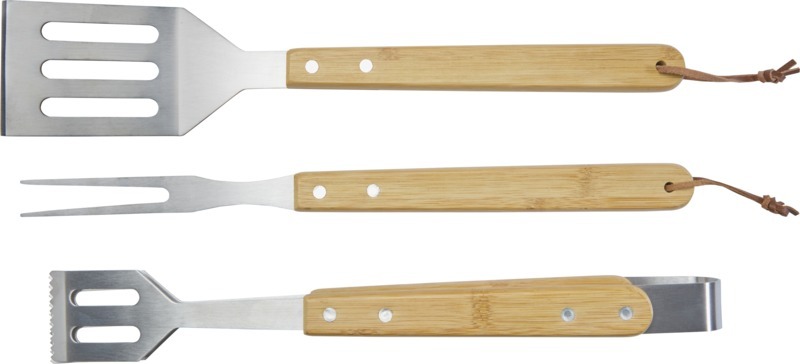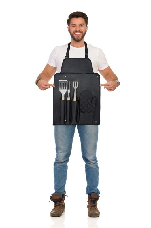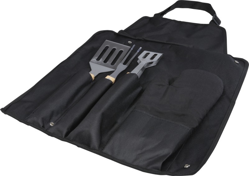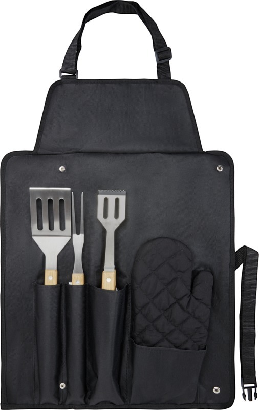 Набор для барбекю из 5 предметов: лопатка (36,5 x 7 см), вилка (36,5 x 2 см), щипцы (36,5 x 5 см), перчатка (25 x 16 см) и фартук с сумкой (42 x 60 см). Ручки сделаны из бамбука, который добывается и производится в соответствии со стандартами устойчивого развития. . Полиэстер, нержавеющая сталь, Бамбуковое дерево.