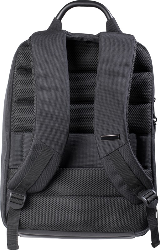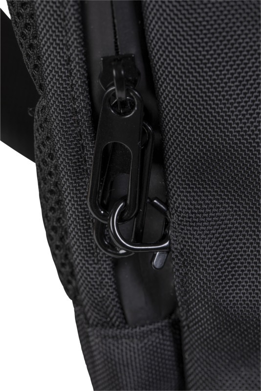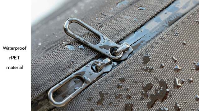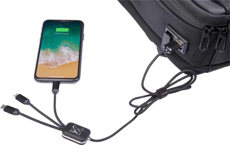 Бизнес-рюкзак из переработанных бутылок с кабелем 3-в-1 (тип C/micro USB/iPhone). Оснащен встроенной батареей быстрой зарядки емкостью 10 000 мАч и зарядным кабелем со светящимся логотипом. Аккумулятор подключается к двум внешним разъемам (USB и Android). В целях безопасности предусмотрены защитный карман RFID и блокировка молнии. Мягкие отделения для ноутбука и планшета, ремешок для переноски и потайной задний карман. Изготовлен из водонепроницаемой ткани и переработанных пластиковых бутылок. Патент Ведомства по интеллектуальной собственности Европейского союза. Переработанный PET пластик.