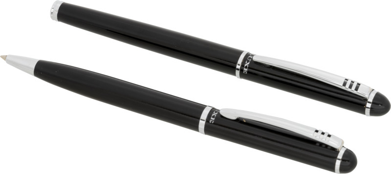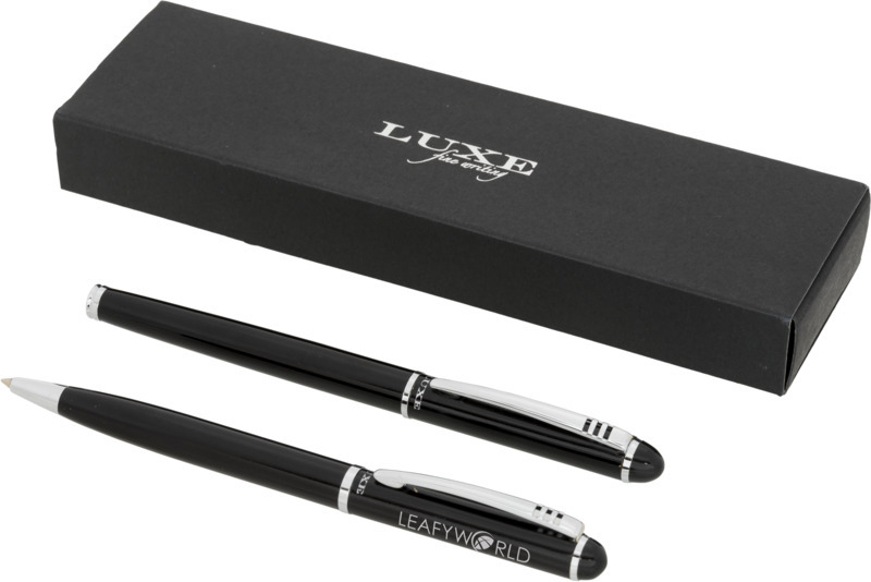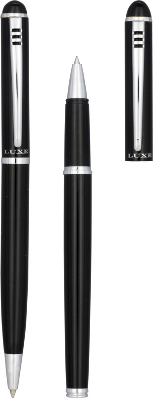 Эксклюзивный набор с шариковой ручкой с поворотным механизмом и ручкой-роллер с колпачком. Предлагается глянцевый черный, матовый серебряный и матовый синий цвета. Предлагается в подарочной коробке LUXE (17 x 5,5 x 3 см). Металл.