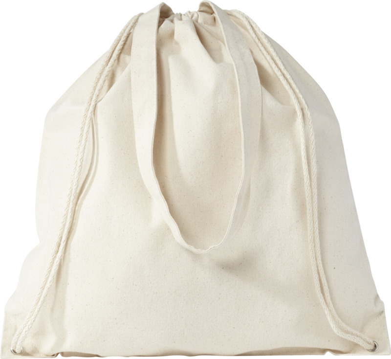 Многофункциональный хлопчатобумажный мешок с длинными ручками и затягивающим шнурком, который можно носить в качестве сумки для покупок или рюкзака. Большой основной отсек, закрывающийся затяжкой шнурка. Имеет две выпадающие ручки длиной 31 см. Вместимость: 1,5 л, выдерживает до 5 кг веса. Хлопок, 240 g/m2.