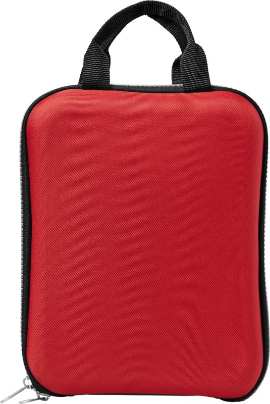 Удобный автомобильный набор для оказания первой помощи, включающий треугольный бандаж, ножницы, 2 булавки, 2 повязки, 1 бумажную ленту, 15 пластырей, 8 спиртовых тампонов, 2 мокрые салфетки, 2 салфетки, 10 марлевых прокладок, профессиональный жилет безопасности, плед и динамо-фонарь. Соответствует стандартам EN13485 и ISO EN 20471. EVA Plastic.