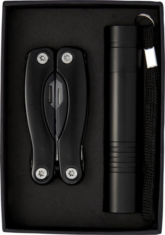 11-тифункциональный инструмент с диодным фонариком упакован в черную картонную коробку. Батарейки в комплекте. Алюминий.