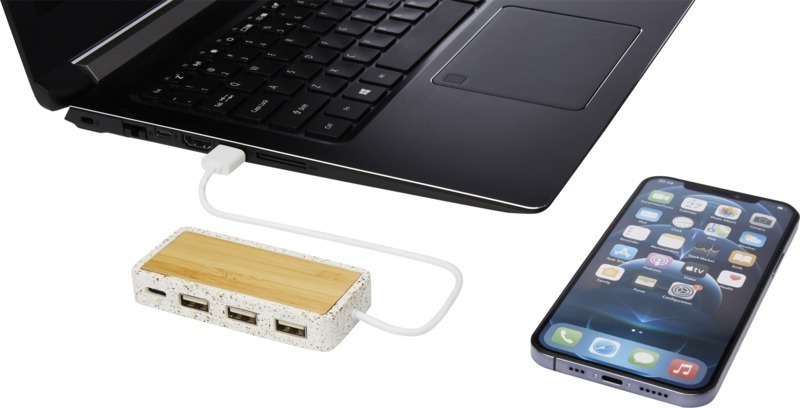 Концентратор USB 2.0, изготовленный из сочетания натурального терраццо и бамбука. Включает 1 выход Type-C и 3 выхода USB-A. Поставляется в подарочной коробке и с инструкцией по эксплуатации (изготовленных из экологичных материалов). Limestone, Бамбуковое дерево.