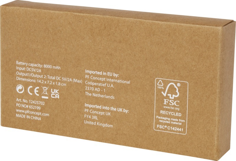 Портативное зарядное устройство из бамбука емкостью 8000мАч с двумя USB-выходами. Встроенная солнечная панель предоставляет возможность быстрого восполнения заряда и идеально подходит для активного отдыха. Оборудовано входом Type-C 5V/2A, USB-выходом 5V/1A и USB-выходом 5V/2A. Для обеспечения устойчивости вспомогательные кабели не предусмотрены. Поставляется в подарочной коробке и с инструкцией по эксплуатации (изготовленных из экологичных материалов). Бамбуковое дерево. Packaging: FSC Recycled 100% P5.1 CU-COC-877277.