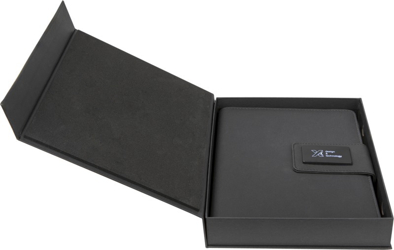 Блокнот со встроенным беспроводным зарядным устройством на 4000 мАч с подсветкой логотипа и интегрированным кабелем «3 в 1» (Type C, Android, iPhone). Входная мощность: 5 В/1 А. Выходная мощность: 5 В/2 А. При открытии загорается лого на застежке. Эта функция работает до 25 дней без подзарядки устройства! В сменном блокноте содержится 30 страниц формата A5. Поставляется в подарочной коробке из переработанной бумаги с магнитной застежкой. PU covered cardboard, Переработанная бумага.