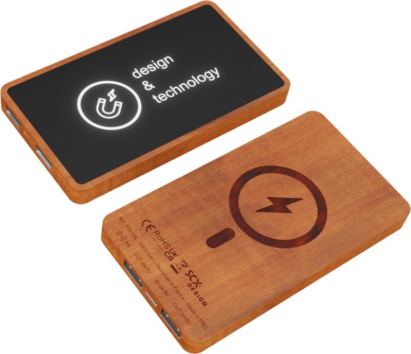 Магнитное беспроводное портативное зарядное устройство емкостью 5000 мАч (12,6 x 7 x 1,8 см) с функцией беспроводной зарядки мощностью 5 Вт. Портативное зарядное устройство имеет два USB-выхода (2 А) и корпус из кленовой древесины. Передняя сторона имеет мягкое покрытие и логотип с подсветкой, наносимый лазерной гравировкой. Если телефон не оснащен технологией MagSafe (начиная с iPhone 12), к его задней части можно прикрепить магнитную наклейку (входит в комплект), чтобы сделать его совместимым с поставляемым магнитным креплением. Поставляется с зарядным кабелем 3-в-1 (type C, micro-USB, iPhone) из переработанного ПЭТ-пластика. Упаковывается в подарочную коробку (20,1 x 10 x 2 см) с магнитной застежкой. Гарантия 3 года. Дерево, Переработанный PET пластик.