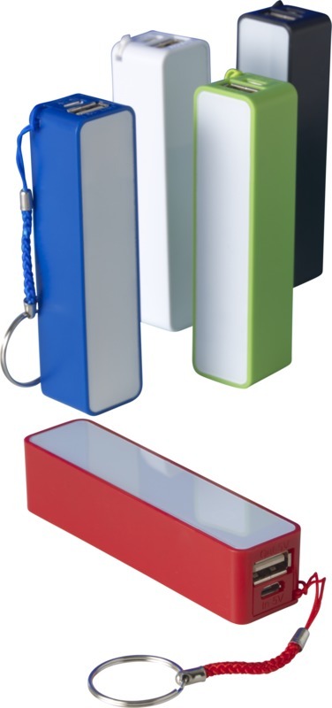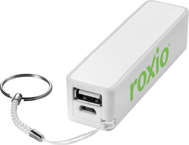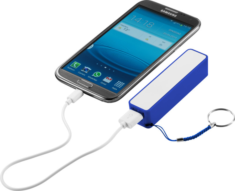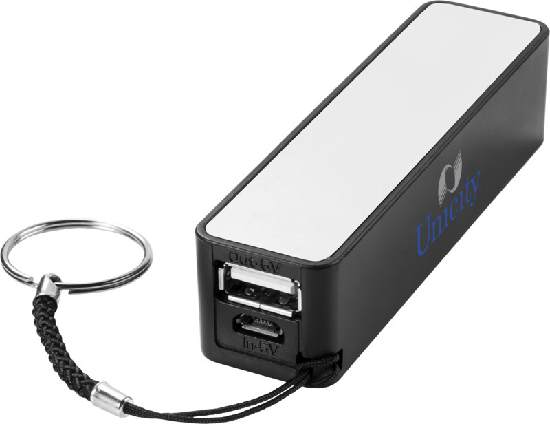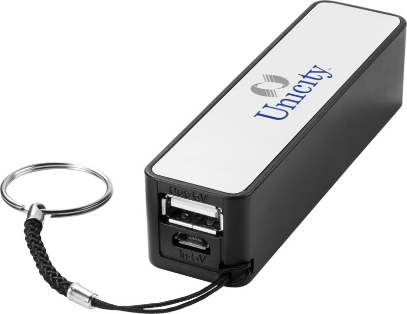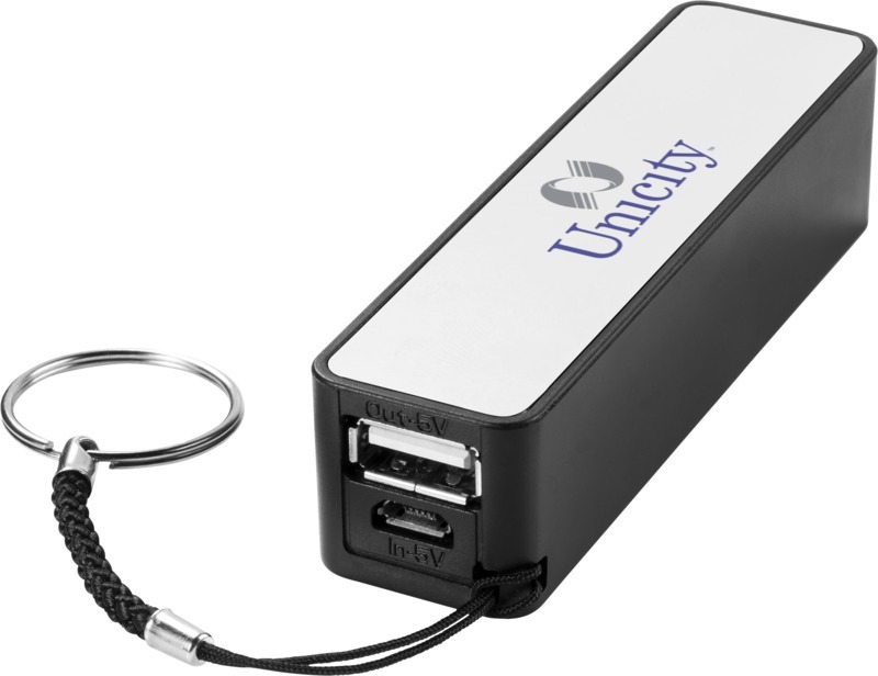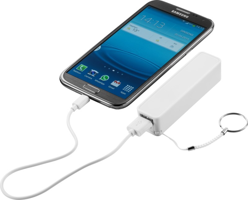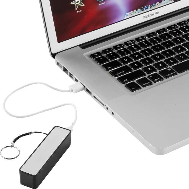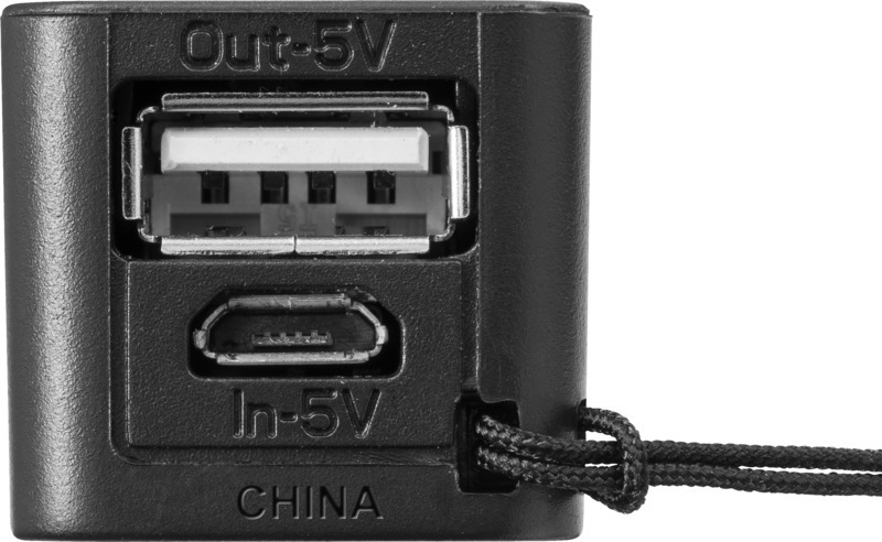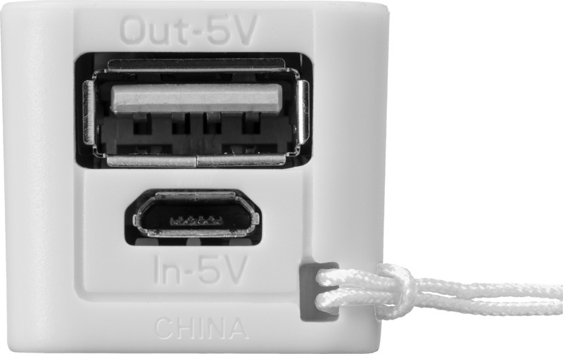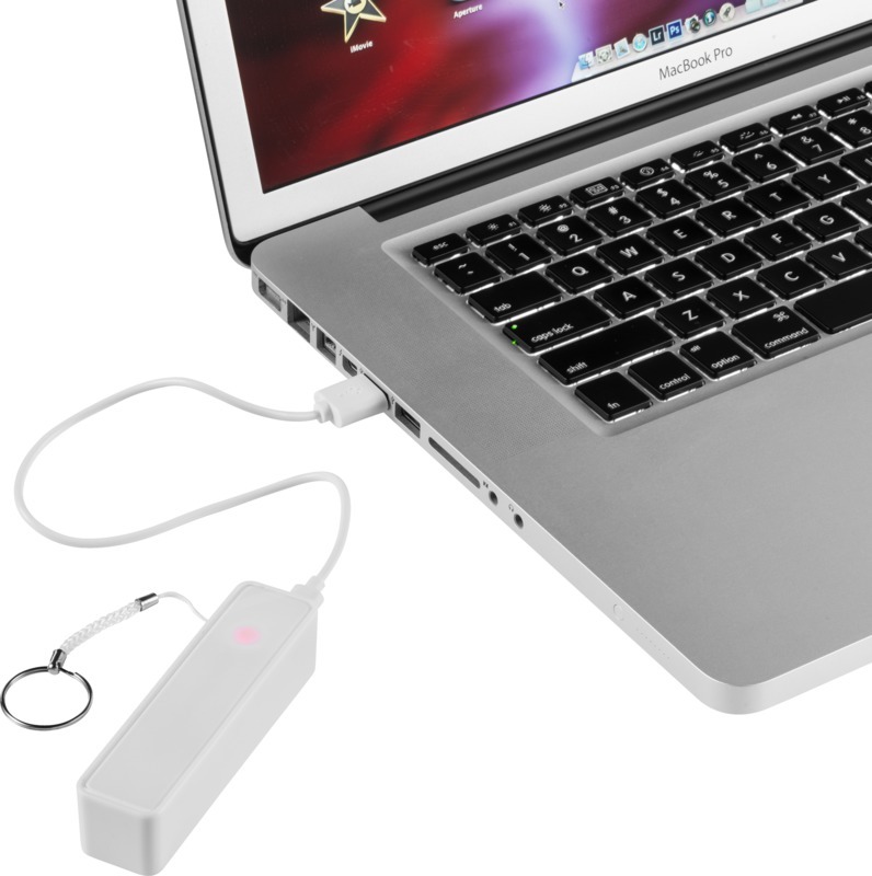 Зарядное устройство с аккумулятором емкостью 2000 мА/ч и светодиодным индикатором для обозначения зарядки. Зарядное устройство заряжается через кабель USB в течение около 2 часов. Включает металлическое кольцо для ключей и белую картонную коробку. Пластик ABS.