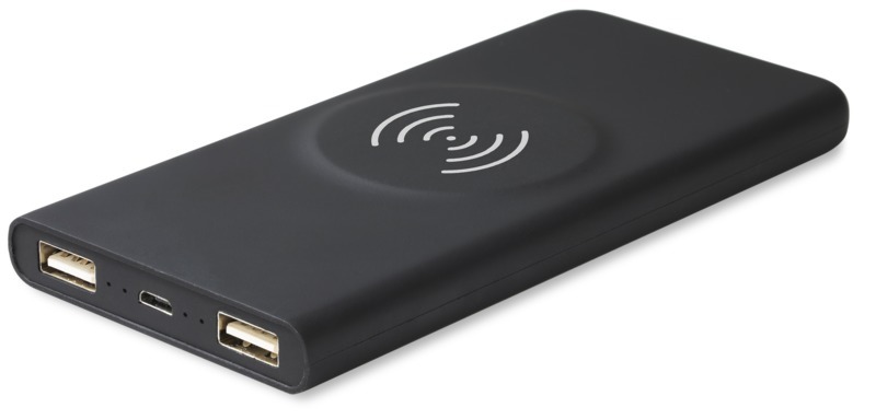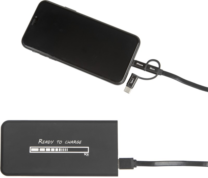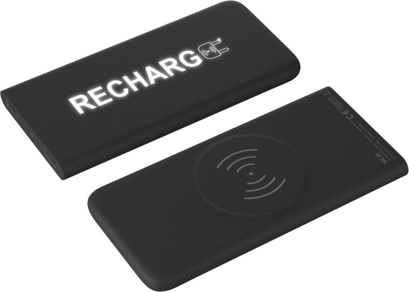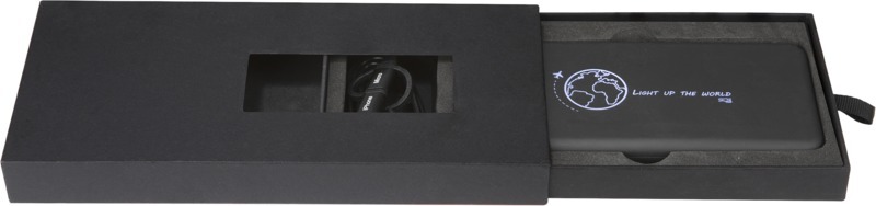 Беспроводное зарядное устройство soft-touch емкостью 5000 мАч с подсветкой логотипа и алюминиевым кабелем «3 в 1» (Type C, Android, iPhone). Устройство подсвечивается в течение 30 секунд, когда к нему прикасаются, или когда оно заряжается. Емкость: 5000 мАч. Входная мощность: 5 В/2,4 A (micro). Выходная мощность: 5 В/2,4 A (USB). Выходная мощность беспроводной зарядки: макс. 5 В/2 A. Частота: 110–205 кГц. Вес нетто: 148 грамм Размер: 140×67×11,8 мм. Поставляется в подарочной коробке из бумаги вторичной переработки. Пластик ABS, Переработанный PET пластик.