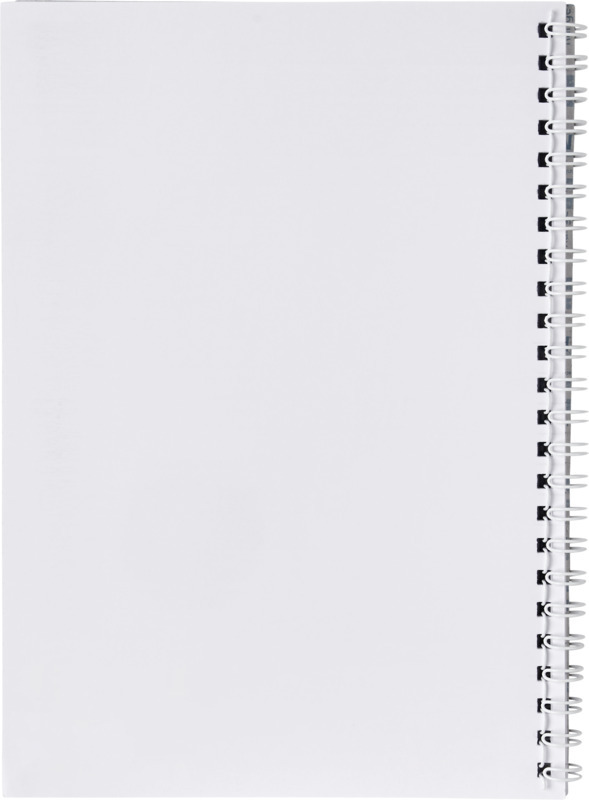 Блокнот формата A5 имеет белую или черную спираль, чистые листы плотностью 80 г/м2 и глянцевые переднюю и заднюю обложки (250 г/м2). Стандартная модель поставляется с 50 листами, но блокнот также доступен с 80 листами. Печать возможна на листах, а также на передней и задней обложках. 70% Бумага, 30% Картон. FSC Mix Credit P7.2 CU-COC-877277.