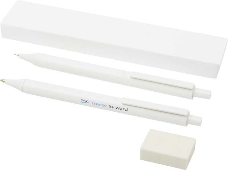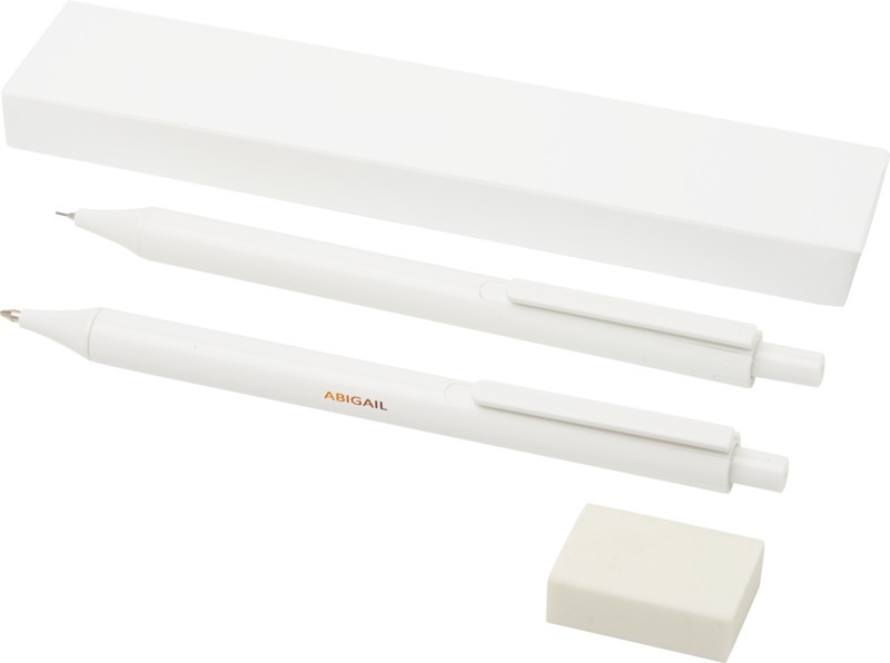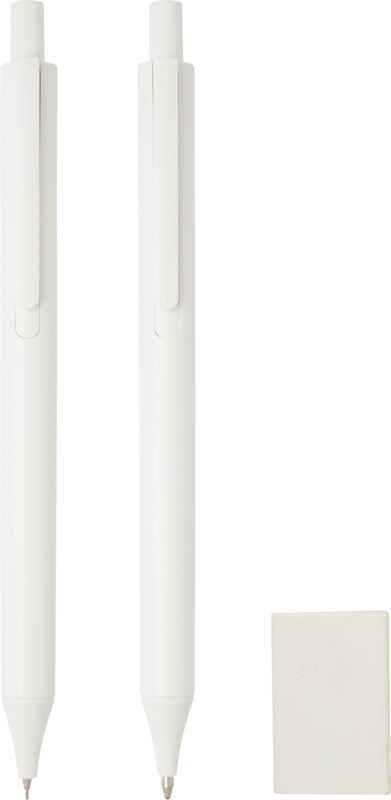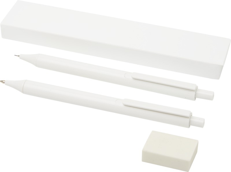 Комплект антибактериальных канцелярских принадлежностей, состоящий из шариковой ручки с нажимным механизмом, механического карандаша и ластика. Нанопорошковая добавка уменьшает рост микроорганизмов на поверхности ручек. 95% Пластик PP, 5% Antibacterial additive.