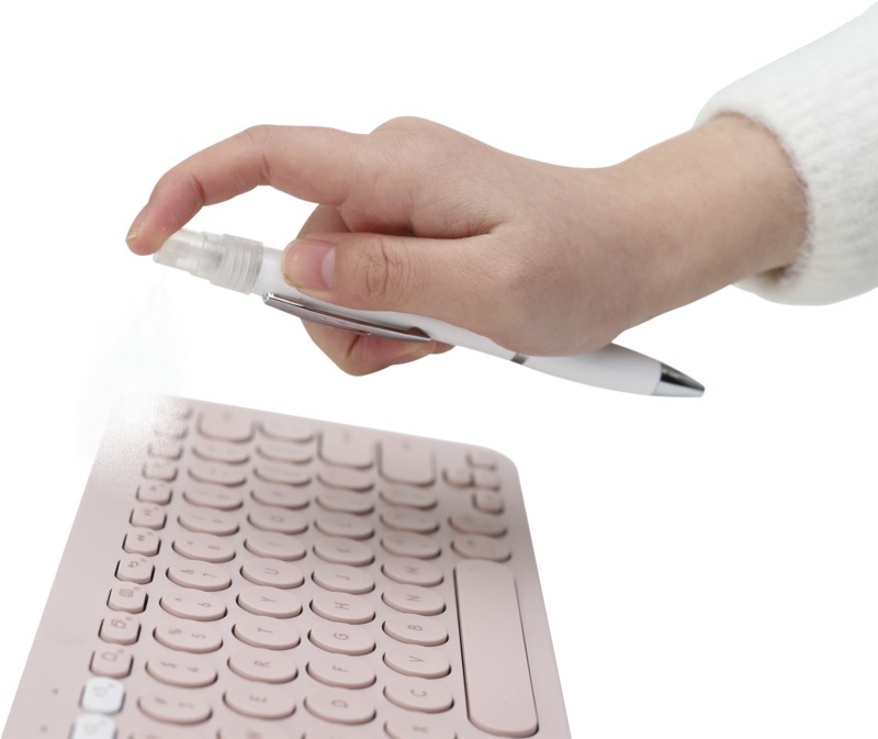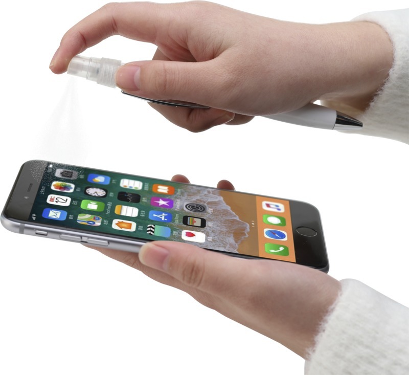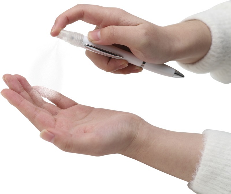 Шариковая ручка с заполняемым распылителем и защитным колпачком. Распылитель можно заполнять спиртом или другой очищающей жидкостью для дезинфекции рук и/или поверхностей. Для заполнения нужно просто открутить насадку распылителя. Емкость распылителя составляет 3 мл. Жидкость в комплекте не поставляется. Пластик ABS.