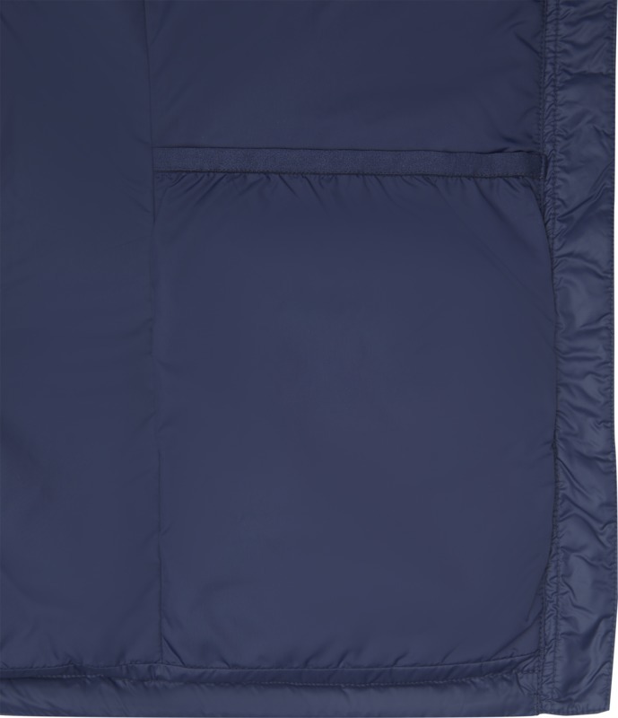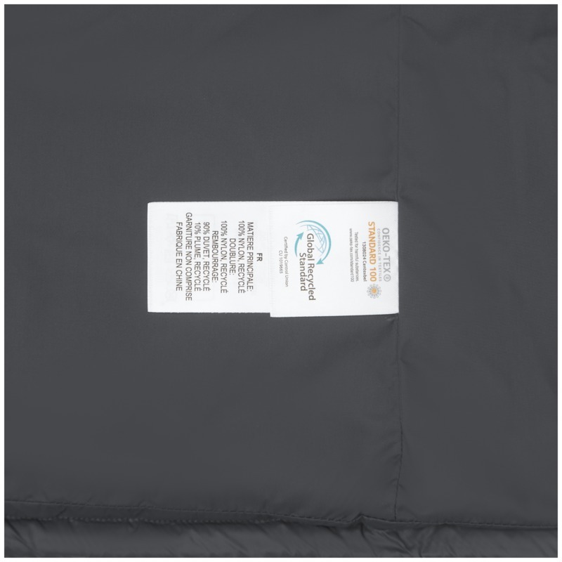 Dull cire 380T woven with water repellent finish of 100% GRS certified recycled nylon, Padding/filling, Down insulation: Responsible Down Standard (RDS) of 10% Recycled feathers and 90% Recycled down, 115 g/m2